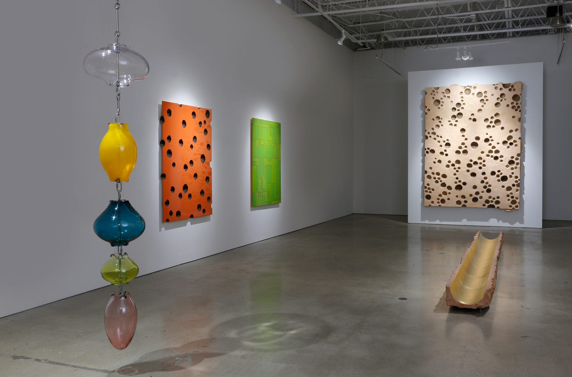 Objects borne out of nature become a testing ground for the artist, who collects material like acorn tops, coconut shells, palm fronds, and gourds from the surroundings of his Mexico City studio. The forms of gourds and coconut shells are present throughout some artworks in the show, either by direct input or by illusion. In several wall pieces, raw, recessed spheres emerge from imprints of gourds on polyurethane foam or board, contrasted with their highly polished and colorful surfaces. The concept of the vessel has remained throughout Glassford’s practice since the ‘90s, considering the history of the gourd as the first canteen used by civilizations to transport water. The iconography of the gourd dates back to pre-Columbian times when Indigenous civilizations cultivated and utilized them in ritual, medicine, and art, and still holds cultural significance in Mexico today. Along the center of the gallery, a seven-part stone sculpture, made from the off-cuts of stone pilings, is situated on the floor like a canal. Glassford sourced these remnants and assembled them into an aqueduct lined with gold leaf, recalling the remains of the Aztec aqueduct system that brought potable water to Tenochtitlan, now known as Mexico City.