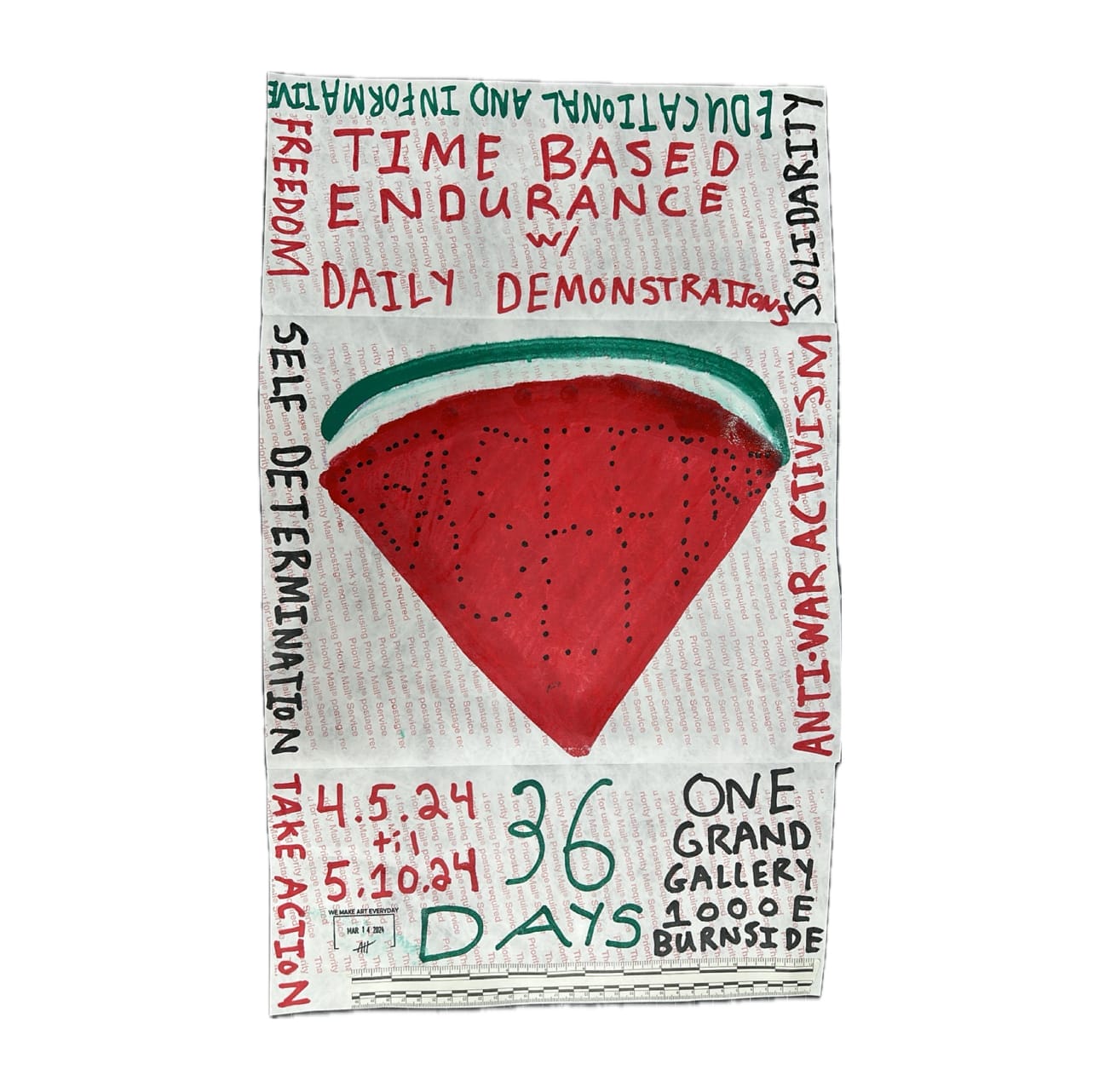 One Grand Gallery presents an endurance and protest art installation by Portland-based maker Aaron Hankins. “Ceasefire” will open on April 5th, with an artist reception from 6-9p, and run through May 10th, 2024. For each day of the ongoing war and genocide in Gaza, Hankins has painted a watermelon, a self-appointed symbol of the Palestinian people, on the backs of empty USPS mailers. The seeds of the watermelon are painted in such a pattern as to denote numerical order and serve as a physical log of the days at unrest. Hankins displays these individual works as a cohesive unit stitched together in a 50 ft and growing banner. Seen in this stature, the overwhelming message for an immediate ceasefire cannot be overshadowed.
