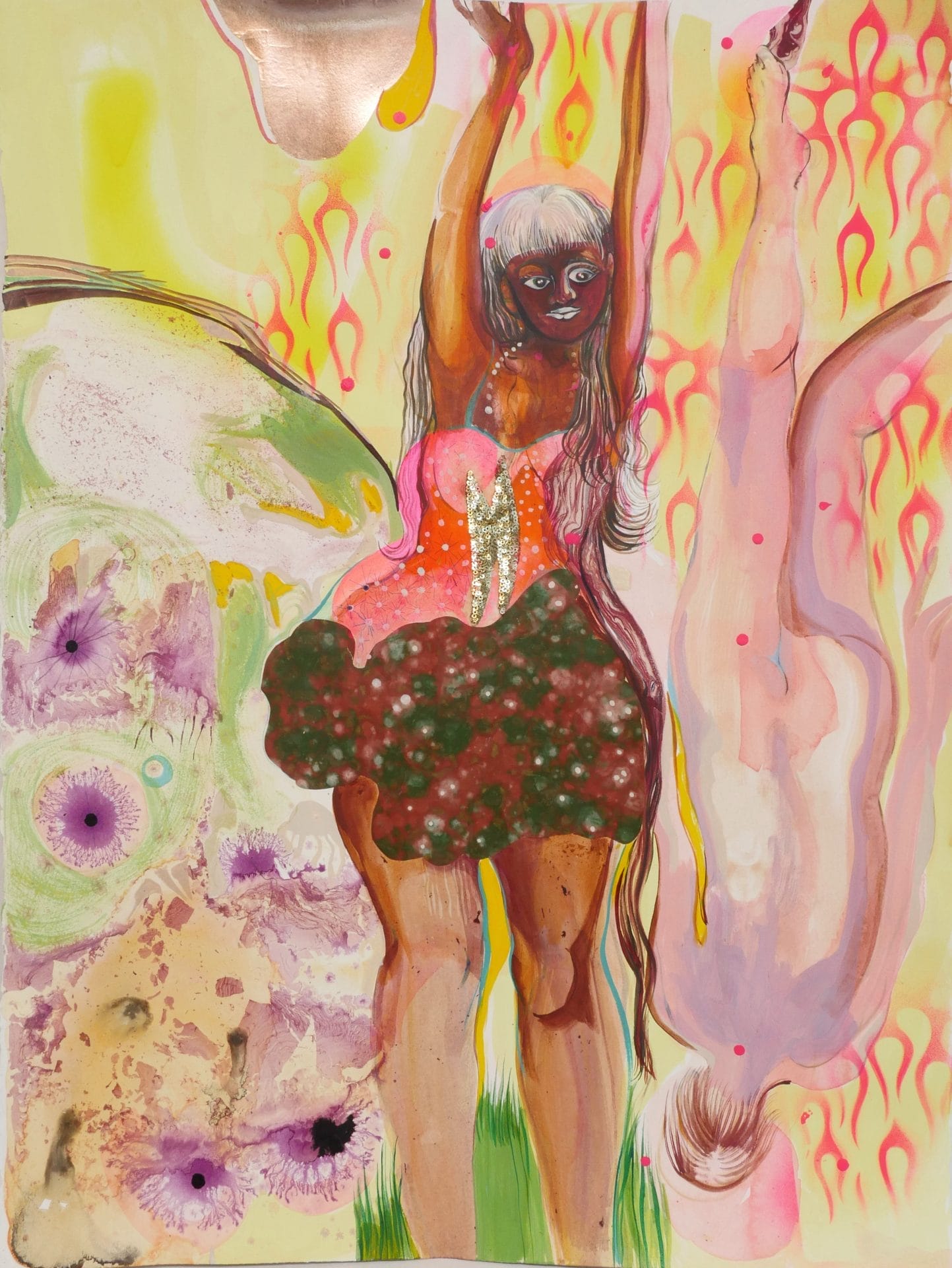 Banerjee’s approach is characterized by its defiance of traditional hierarchies-be they cultural, material, or linguistic. Her multifaceted artistic practice includes crafting fetishistic assemblages from a mix of antiques and tourist-market trinkets; painting and collaging evocative images of women in states of ecstatic transformation; and composing poetic titles that draw viewers into the emotional atmosphere of her creations.