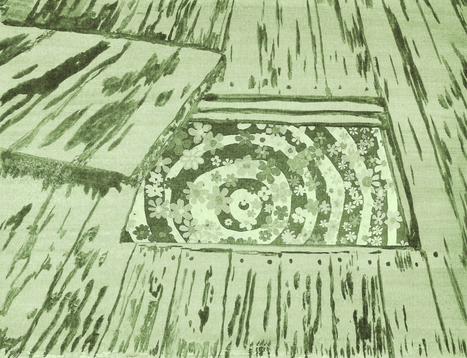 Louise Sheldon’s grommeted pieces, having spent months underfoot, embody a raw, unfiltered interaction with lived spaces. The scuffs and dirt are not mere blemishes but stories told by the material work itself. Adorned with spiral and floral patterns, her pieces evoke mystical portals, where we find ourselves in freefall, hurling through to a different dimension or state of consciousness. These artworks, while being portals in themselves, could also be seen as coverings for Baldridge’s metaphysical trap doors, forming a nuanced and seemingly perfect intersection – a dance of concealment and revelation.