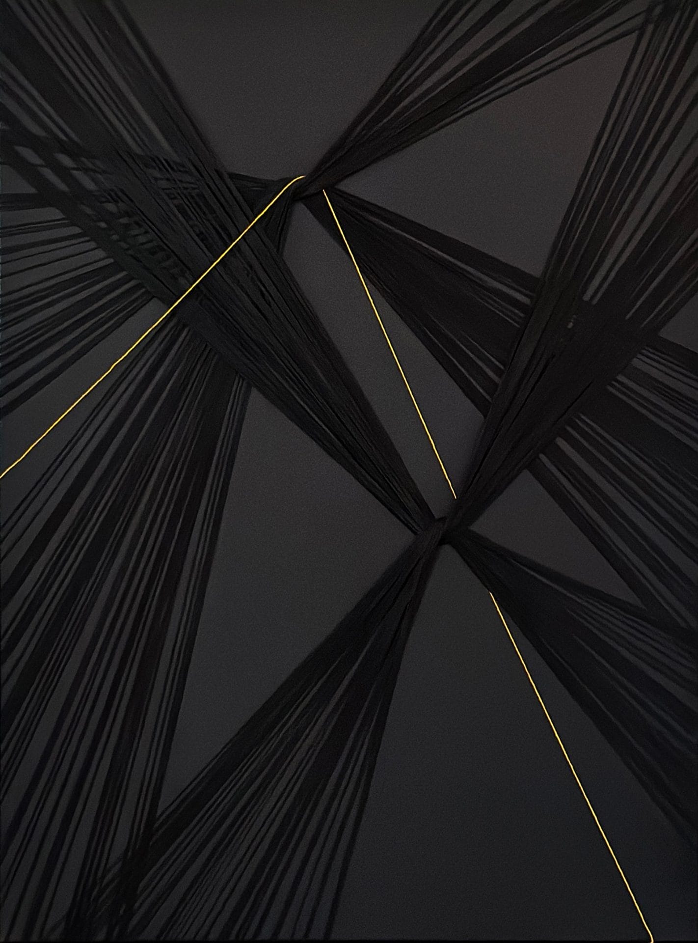 To embody her ideas and express the intensity of her feelings, she developed an entirely new technique. In the past, Khalatbari had always painted in acrylic on prepared canvases. For the new body of work, she worked with string, which she extended across canvas she stretched herself. “I wanted to make everything from scratch to show how this movement grew up from the heart of society, and how people naturally came to the street,” she says. “All of the fibers are natural, evoking women’s hair.”